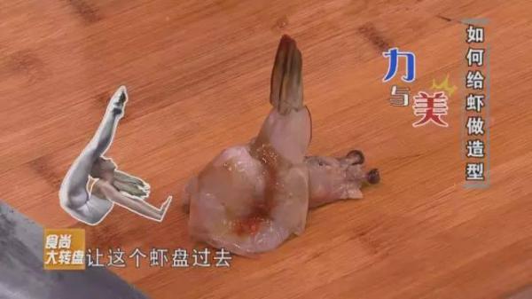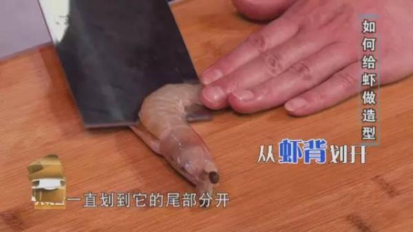 No.1首先给虾做造型。明虾洗净,从虾背划开,一直划到虾的尾部分开。