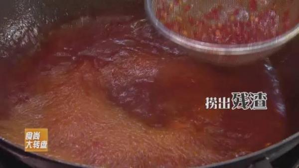 No.5锅内烹入黄酒、水烧开,加入酱油、两勺白糖,调小火慢煮出香气后,捞出残渣。
