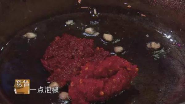 No.4干烧离不开豆瓣酱。另起一锅加入少许油,放入蒜瓣、豆瓣酱、泡椒,煸炒出颜色。