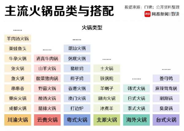 中国大地上的火锅店种类繁多,分为川渝火锅、云贵火锅、粤式火锅、北派火锅、海外火锅、台式火锅 6个大类。