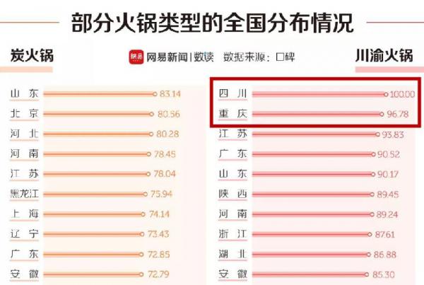 以川渝火锅在四川的数量为上限100 进行对照,川渝火锅在重庆的指数为96.78 ,而韩式火锅和粤式火锅的指数分别为28.81 和44.40 。