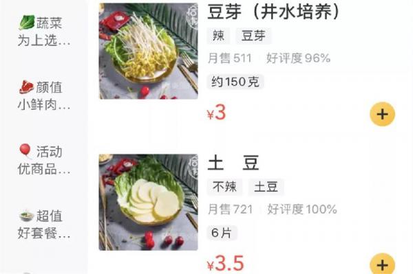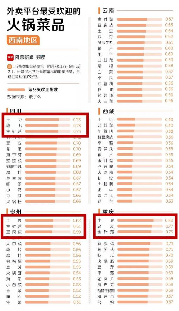 火锅当然离不开涮菜了,经典的食材有毛肚、鸭血、黄喉 等。根据某外卖平台的数据,重庆人点火锅外卖时,最受欢迎的竟然是土豆 !