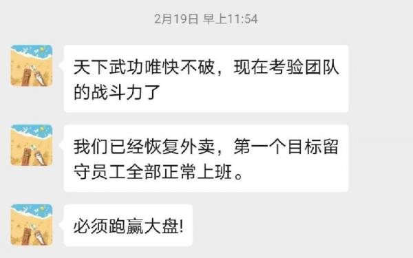 2月19日中午,何总给我发来一条信息,“我们已经恢复外卖,第一个目标留守员工全部正常上班。”