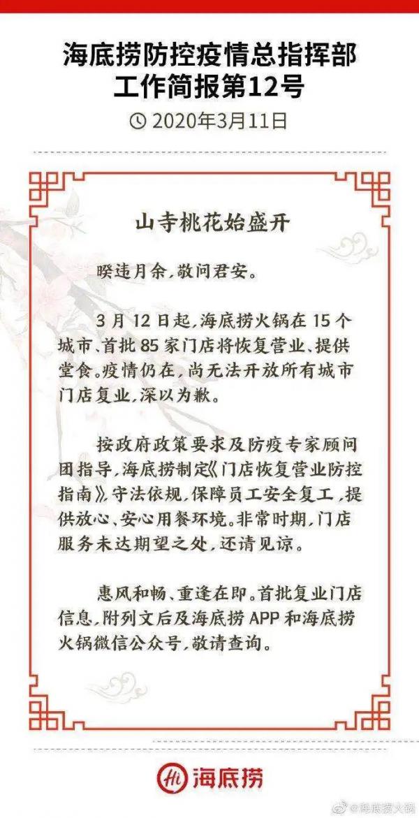 今天(12日),停业40多天的海底捞,终于开门迎客了,15个城市,首批85家门店恢复营业。
