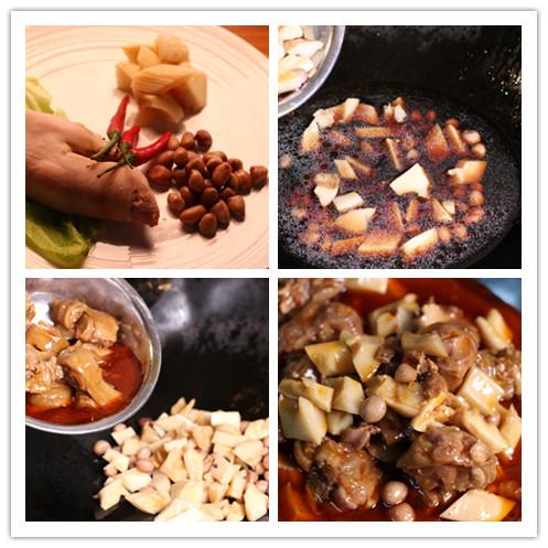 3.热过入油,小火爆香辅料,加入冬笋和猪蹄、花生翻炒5分钟。
