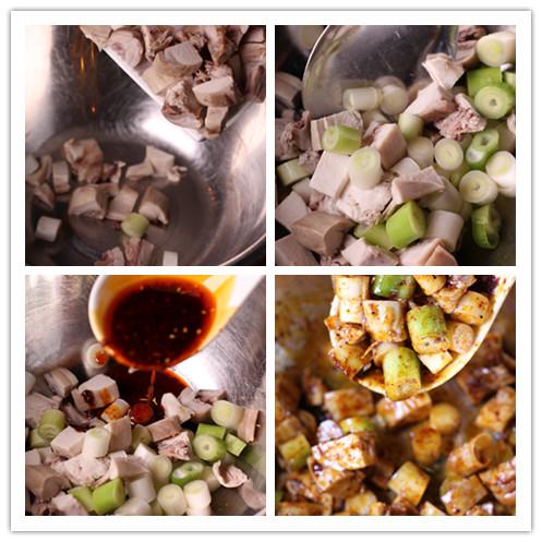 2.更换油锅,加青椒、干辣椒、豆干粒、姜蒜、爆香,用自制的红油、料酒、盐等调味。