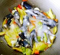 倒入凤爪慢慢翻炒均匀盖上锅盖焖几分钟!(开小火),放入鸡精和盐调味即可。