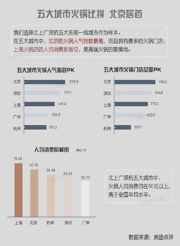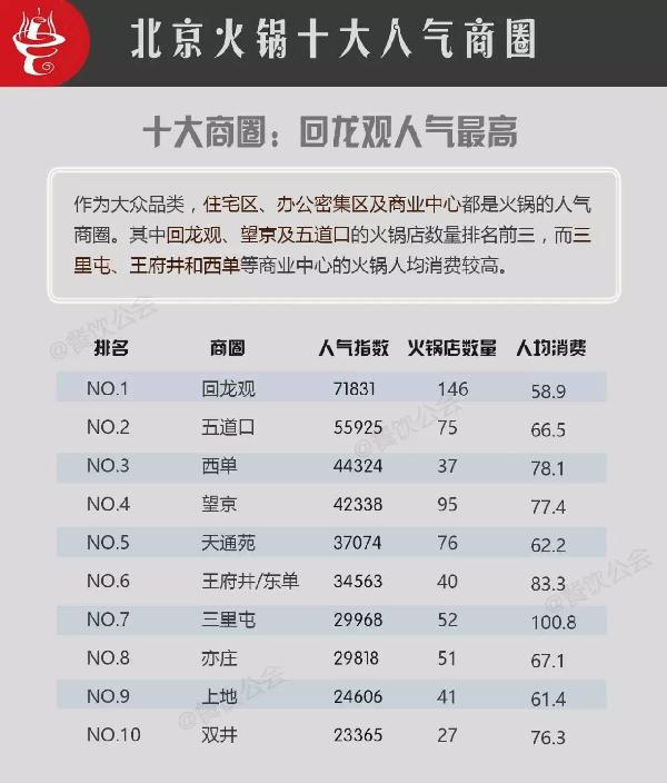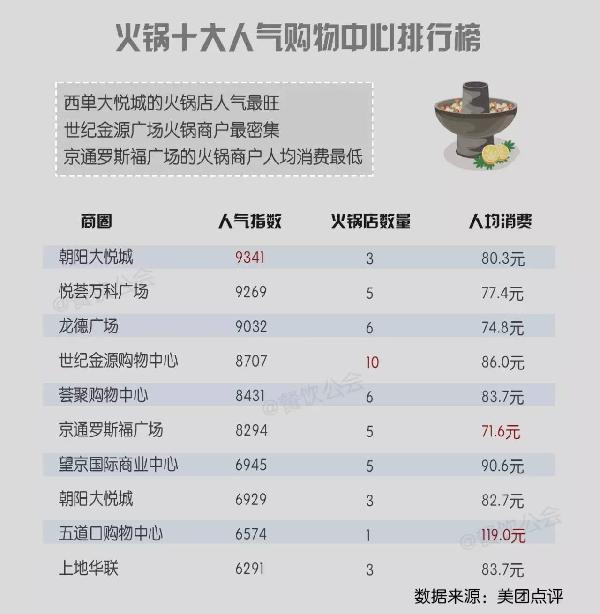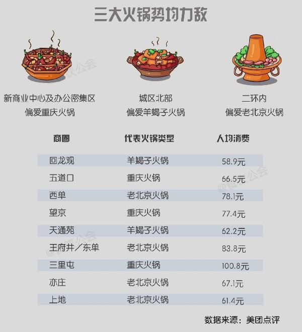2.北京火锅店全城分布,新商业中心及办公密集区偏爱重庆火锅,城区北部爱好羊蝎子火锅,二环内传统的老北京火锅最受欢迎;